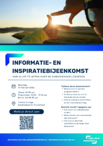 We zijn toe aan een volgende stap! Het subsidieloket opent naar verwachting in het eerste kwartaal van 2026. Maar we kunnen nu al meer vertellen over de inhoud van de Regio Deal, de spelregels, kansen en samenwerking. Daarom nodigen we je van harte uit voor een inspirerende informatiebijeenkomst op 16 februari.