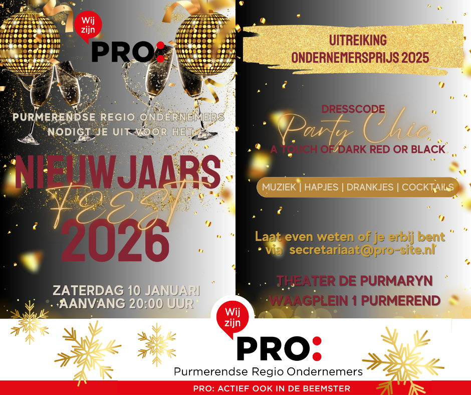 Het bestuur van de PRO: nodigt je van harte uit voor het Nieuwjaarsfeest 2026! We proosten samen op een nieuw ondernemend jaar vol kansen, verbinding en inspiratie.